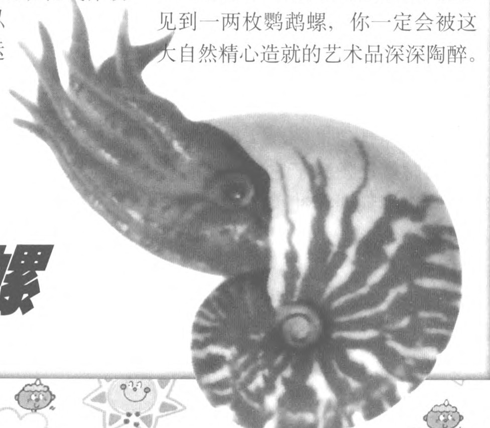 鹦鹉螺是现今地球上活着的古老的头足类软体动物,它有一个回旋的漂亮外壳,极像鹦鹉的头,因而获此美名。别看它们现存的后裔屈指可数,但在三四7亿年前的古生代奥陶纪,它们昌盛得很,品种达5000种之多。中生代以后,因为地球突变,它们相继没落下去,现在只有三五种鹦鹉螺仍冷冷清清地生活在海洋中,被人们称为海洋“活化石”。