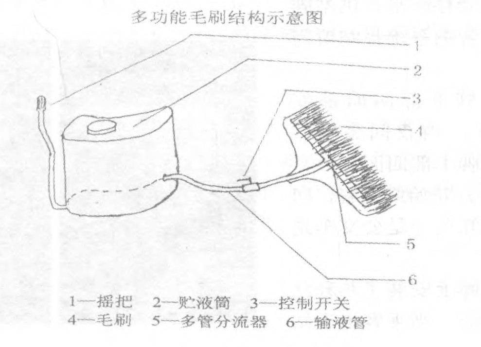 我的这种多功能毛刷是把喷雾器与毛刷组合在一起,并且增设了一个多管分流器,使石灰水能均匀地蘸在刷子上的每一个部位。为了使刷涂效果更好,我还在毛刷的一侧安装了平整器。当需要涂刷房屋的天花板时,可以将毛刷换成空心滚筒式毛刷,我在滚筒内安装多孔喷管,使加压后的涂料通过喷管均匀地喷射在毛刷上。这样刷起来就又快又方便了。