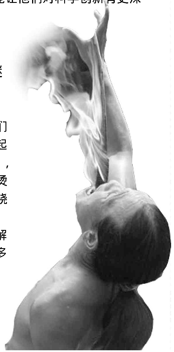 首先同学们观察到那个演员的手一直都是放在火焰下面燃烧,并没有把手放到火把的上面,有学生就想是不是火焰的下面温度比较低呢?通过酒精灯的实验,同学们发现果然火焰的下方即内焰的温度是最低的,所以把手放在火焰下方不容易烧伤,而用口吞火焰时,也是从内焰的位置把火吞入口中的,绝不敢让火把的外焰对着自己的嘴。