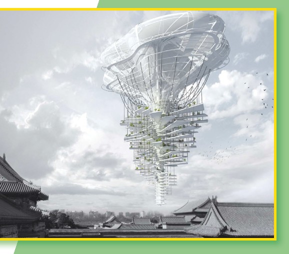 同学们都知道,树木可以吸收大气中的污染物,并为人们提供新鲜的空气。然而,在拥挤的城市,并没有那么多空地可以让人们种树。空中花园则完全悬浮在城市上空,不需要占用一寸土地。空中花园靠顶部的氦气球提供悬浮的动力,下半部分则是螺旋形的花园,其中种植有不少花草树木,可为清新城市空气做贡献。独特安全的结构设计令空中花园不怕狂风暴雨,因此我们不用担心台风会把它们吹走,也不用担心狂风会把树木吹下来砸到我们头上。