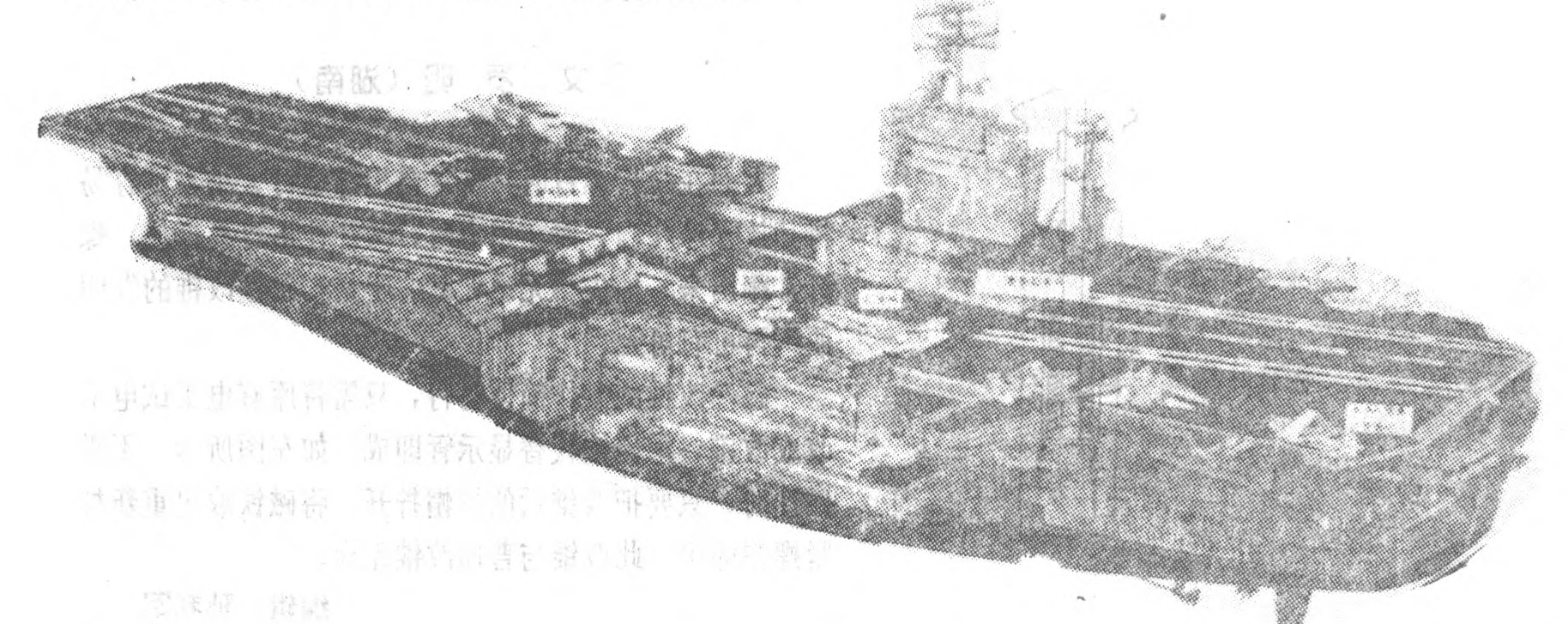 重型航母,飞行甲板以下有10层。1~4层为燃料、淡水、武器弹药舱;5~6为舒适的居住舱和饭厅;7层为飞机修理车间;8~10层的一部分为机库。