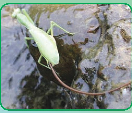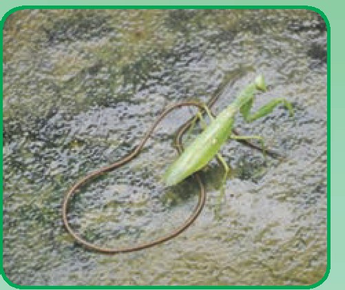 铁线虫的身体细长,直径只有几毫米,但长度可达300毫米~1 000毫米,看上去就像深褐色的铁丝。这种寄生虫平时栖息在河流、湖泊中。当卵在水中孵化并进入昆虫体内时,它就会在昆虫的腹中逐渐生长。当铁线虫发育成熟,需要进入水中交配产卵繁衍下一代的时候,它便会分泌出一种特殊的物质,使被寄生的螳螂、蟋蟀等昆虫失去进食、交配等欲望,彻彻底底变成铁线虫的交通工具,拼尽全力去寻找河流、湖泊,然后一头跳进去,溺死在水中,就好像它们投水“自尽”一般。此时,铁线虫则钻破寄主的肚皮,进入水中产卵。
