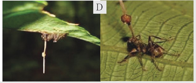 这种古老的寄生生物就是一种寄生真菌。这种真菌可以感染雨林中的木匠蚁,然后让其变为“僵尸蚂蚁”。变成“僵尸蚂蚁”后,木匠蚁不会再继续遵循随蚂蚁大族群一起生活的习性,而是在真菌的控制下独自离开,爬到蚁群经常出没的道路旁的植物叶片上,用大腭紧紧咬住叶脉,倒吊在叶片下方,然后慢慢死去。