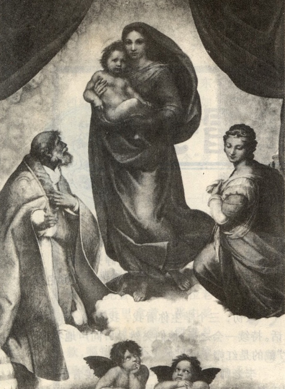 在拉斐尔大量的圣母画中,以《西斯廷圣母》最为有名。(西斯廷是一个教堂,因画在此教堂中,故名西斯廷圣母。)画中的圣母美丽又朴素,赤着双脚站立在云端中;她的怀里抱着小耶稣,圣母的哀愁面容与波提切利笔下的维纳丝很相似,圣母的右下方是年迈的教皇,他仰望着圣母,左手按在胸口表示虔诚,右手则为圣母指引方向。圣母左边行屈膝礼的是圣女巴尔巴拉。圣母子、教皇、巴尔巴拉形成了一个三角形。特别有趣的是画的下方画了两个长翅膀的小天使,他们像两个调皮的孩子,翻着眼睛往上看,但好像又没看见圣母的到来。据说这两个孩子是拉斐尔偶尔在一个面包房前看到的,画家飞快地画下了他们那天真可爱的神态,又把他们安放在圣母画中,使画面严肃的气氛中产生一种诙谐与情趣。