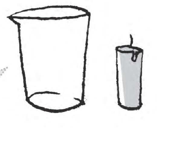 “OK!”表姐边说边跑到厨房找来了杯子、醋和小苏打,“来,让我们先将蜡烛固定在杯底。”只见表姐点燃蜡烛后,将蜡液滴到了杯底,然后顺手把蜡烛插到蜡液上固定住。