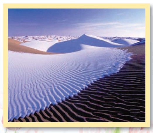 下雪在纳米比亚的沙漠上并非罕见,但整个沙漠被雪覆盖那就有些闻所未闻了。据统计资料显示,这样的现象每10年才会出现一次。2011年6月在纳米比亚沙漠上下起了鹅毛大雪,气温低至零下负七度。这片有五千万年历史被誉为世界上最古老的沙漠,在这样的环境里出现这样的景象让人感到惊奇。