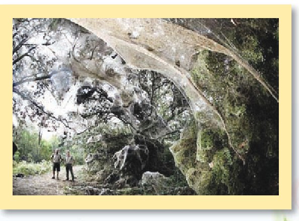 一场大洪水淹没了巴基斯坦的五分之一,数百万的蜘蛛爬进树里避难。水退后它们竟然就在树上结茧织网,形成一株蜘蛛网树。在美国的得克萨斯州也有不少蜘蛛网树,而且规模更大,长度高达180米,让人感到有些毛骨悚然。专家通过对这些蜘蛛的研究,发现这个庞大的“网络”是由12个家族的蜘蛛组成的。但现在也不知道是什么原因造成这样一个罕见的现象。