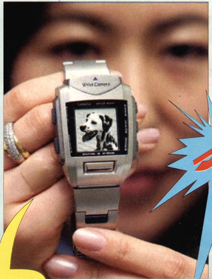 图为一家日本公司最新推出的手表型的数字照相机样品,这款照相机带一个小的黑白屏幕,有1M的存储空间,可以存100张照片。