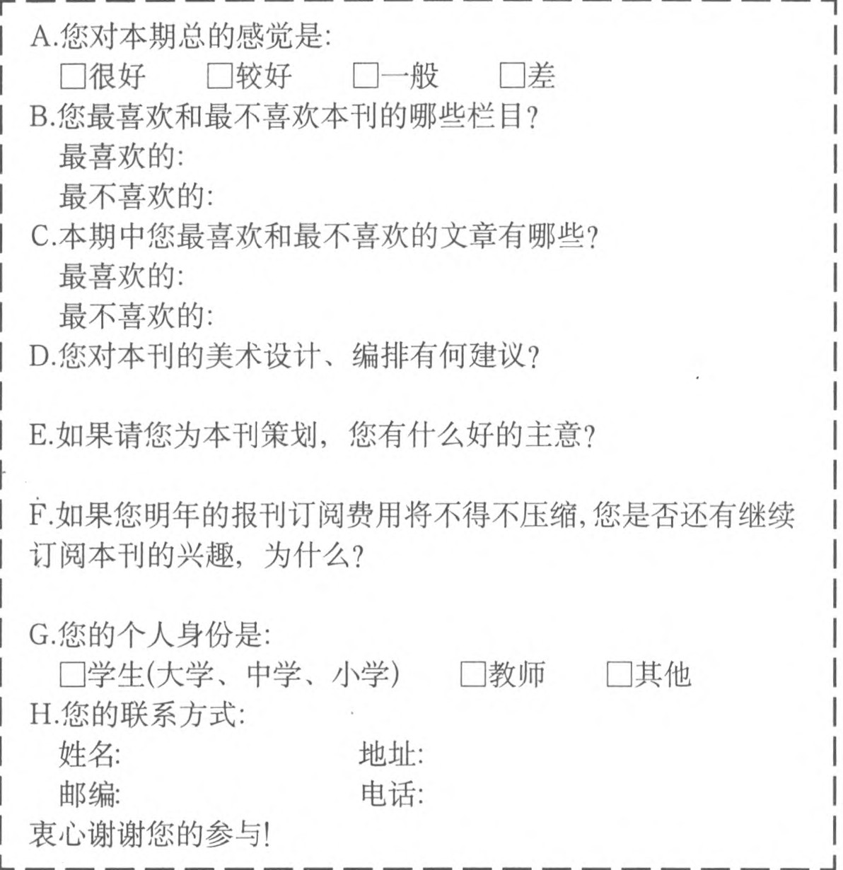 “启迪科学智慧,培养创新思维”是本刊宗旨。为把本刊办成同类期刊中的精品,为广大读者知提供更丰富的精神食粮,本刊读者问卷调查现已展开。请您回答下述问题后,将答案寄给我们(410008湖南省长沙市彭家井11号《科学启蒙》编辑部戴伟收),本刊将把读者的心声集中刊登,并对提出有建设性意见的读者予以奖励。