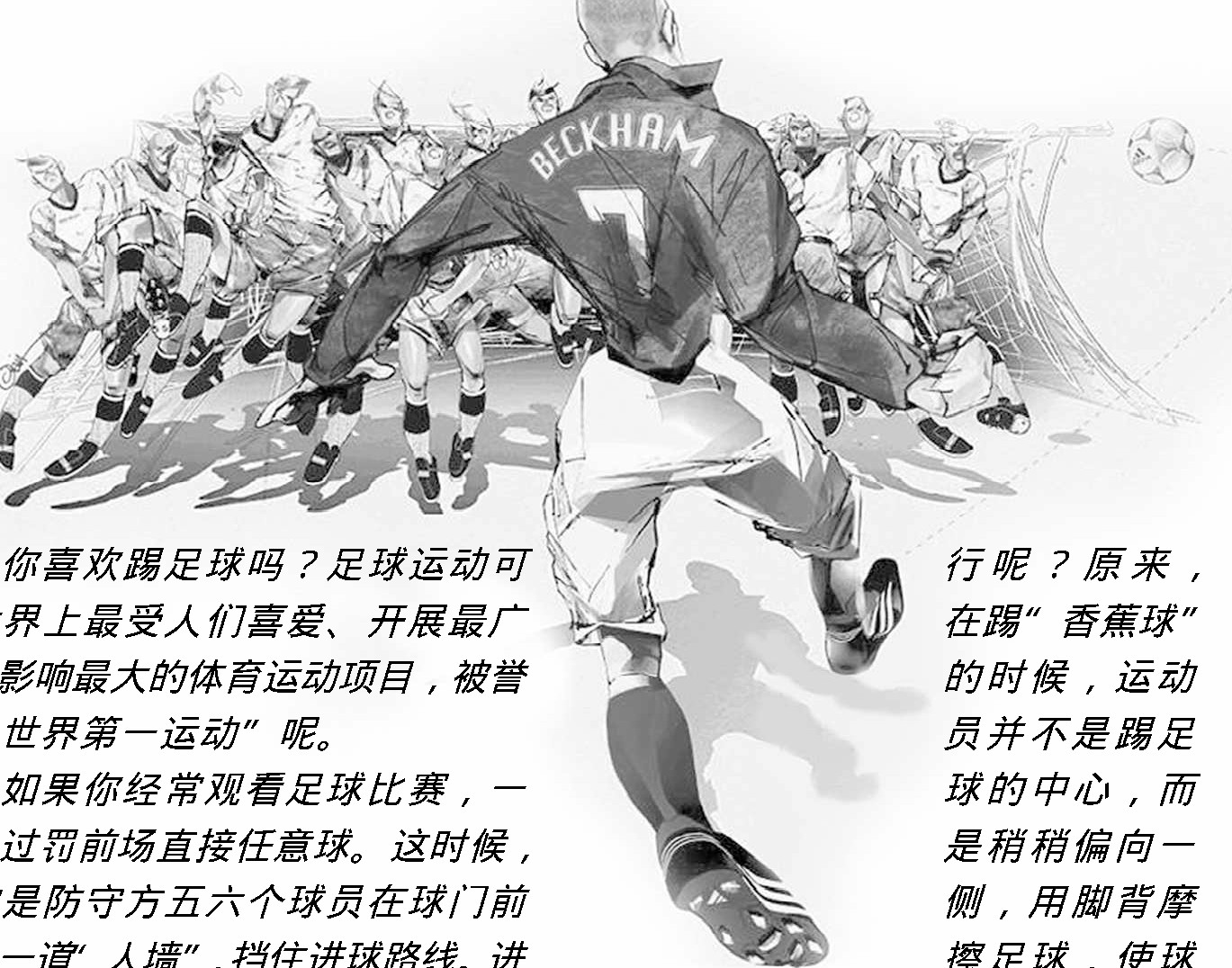 如果你经常观看足球比赛,一定见过罚前场直接任意球。这时候,通常是防守方五六个球员在球门前组成一道“人墙”,挡住进球路线。进攻方的主罚队员,起脚劲射,球绕过了“人墙”,眼看要偏离球门飞出,却突然沿弧线拐过弯来直入球门,让守门员措手不及,眼睁睁地看着球进了大门。这就是人们说的“香蕉球”。