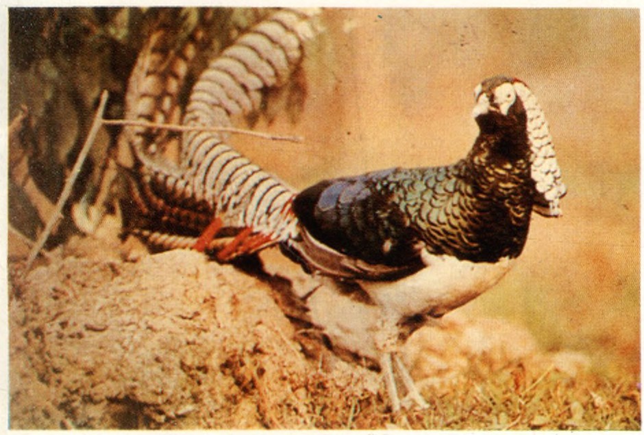 ▲铜鸡:又名白腹锦鸡,体长约600~1500mm,雌雄异色,雄性(本图)头顶、背、胸为翠绿色,有金属光泽,冠羽紫红色,后颈有一白色披肩,上有蓝绿、黑色斑纹,腹部白色,尾甚长具黑色横纹,栖于海拔2000~4000米的林间灌木及开扩地带,以植物性食物为主。分布在我国西南地区。
