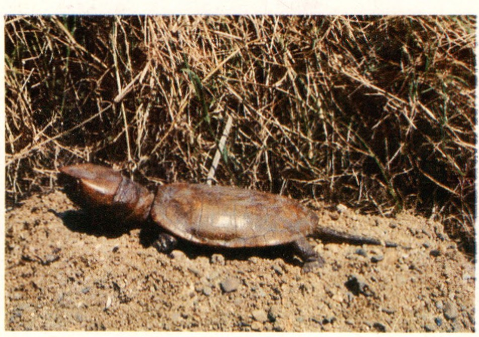 ▲平胸龟:又名大头平胸龟,与其他龟相比,其显著特征是头大、不能缩入龟甲内,且上颌前端向下钩突,如鹰嘴,又名鹰嘴龟。栖息于山溪冷水之中,以鱼及无脊椎动物为食,分布在我国南方广大地区。