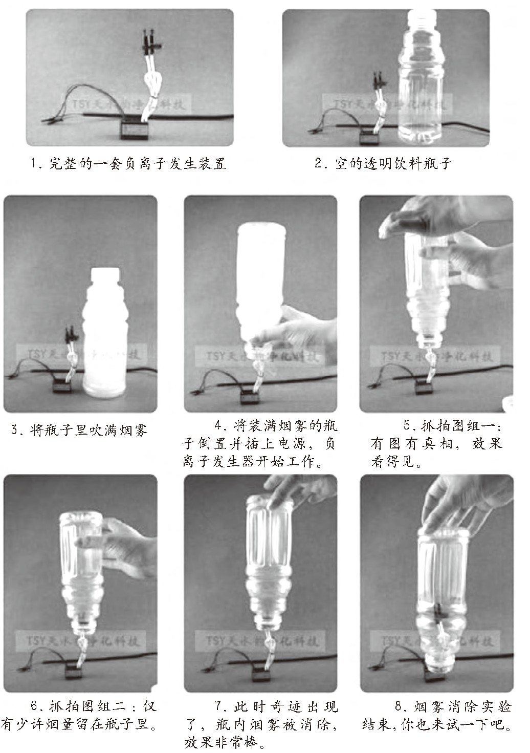 取一装满烟雾的塑料瓶,打开瓶盖,将已接通电源的负离子发生器的发射端朝向瓶内。1分30秒过后,烟雾基本被除尽。