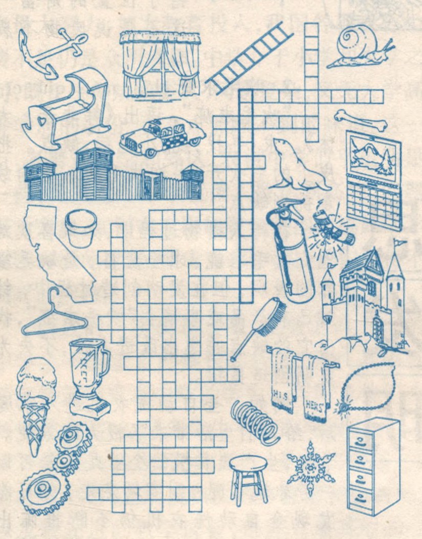 考考你的英文水平和思维的敏捷程度,先把附图一一译写出英文名称,再将这些英文名称全部填入空格中,纵横要连贯。提示,粗线框内是灭火器的英文名称。
