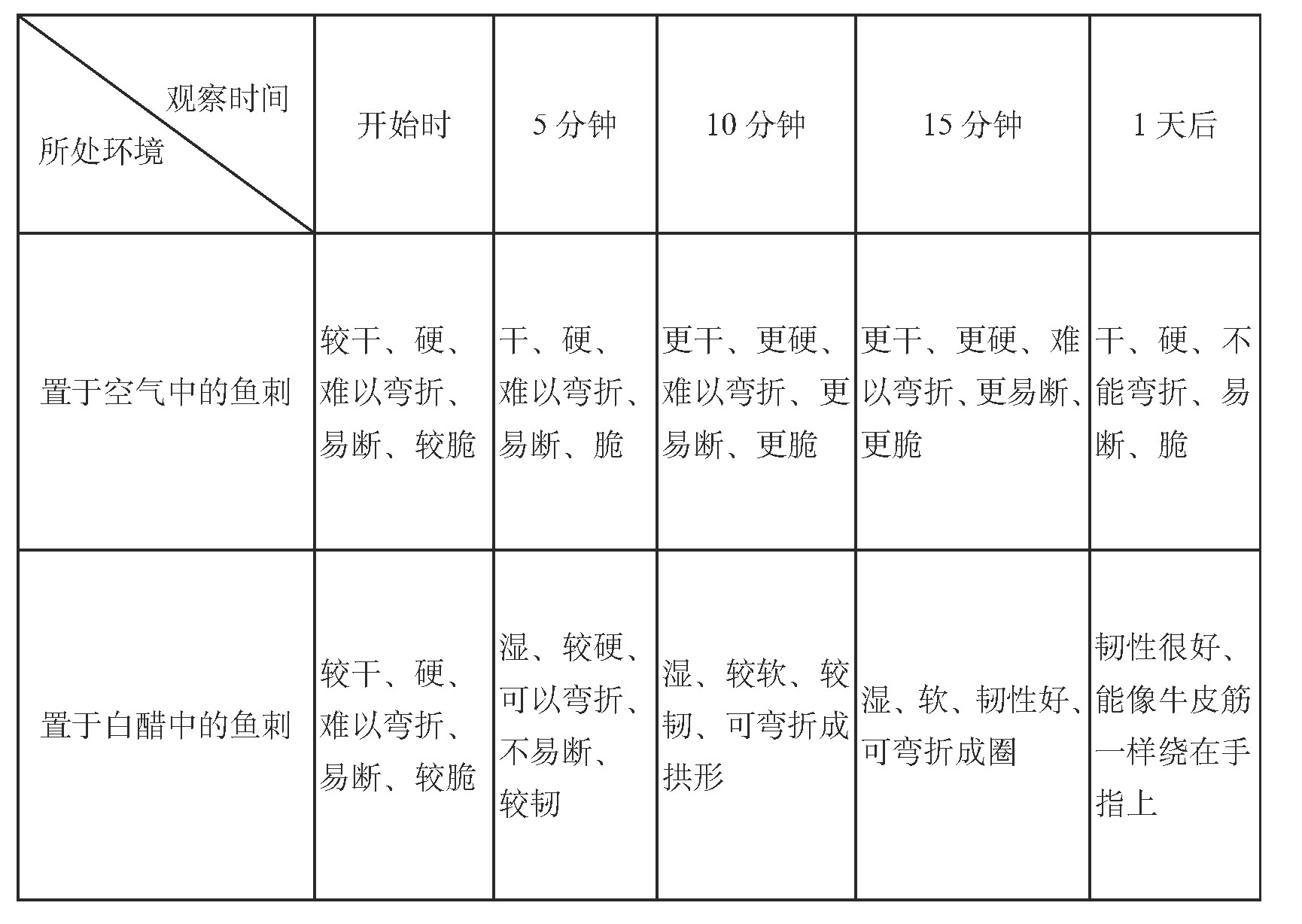 我发现10分钟后,放置在空气中的鱼刺“更干、更硬、难以弯折、更易断、更脆”,放置在白醋中的鱼刺变得“湿、较软、较韧、可弯折成拱形”;1天后,放置在空气中的鱼刺越来越干,越来越硬,韧性差,难以弯折,而放置在白醋中的鱼刺慢慢变软,韧性越来越好,能轻而易举地绕在手指上。