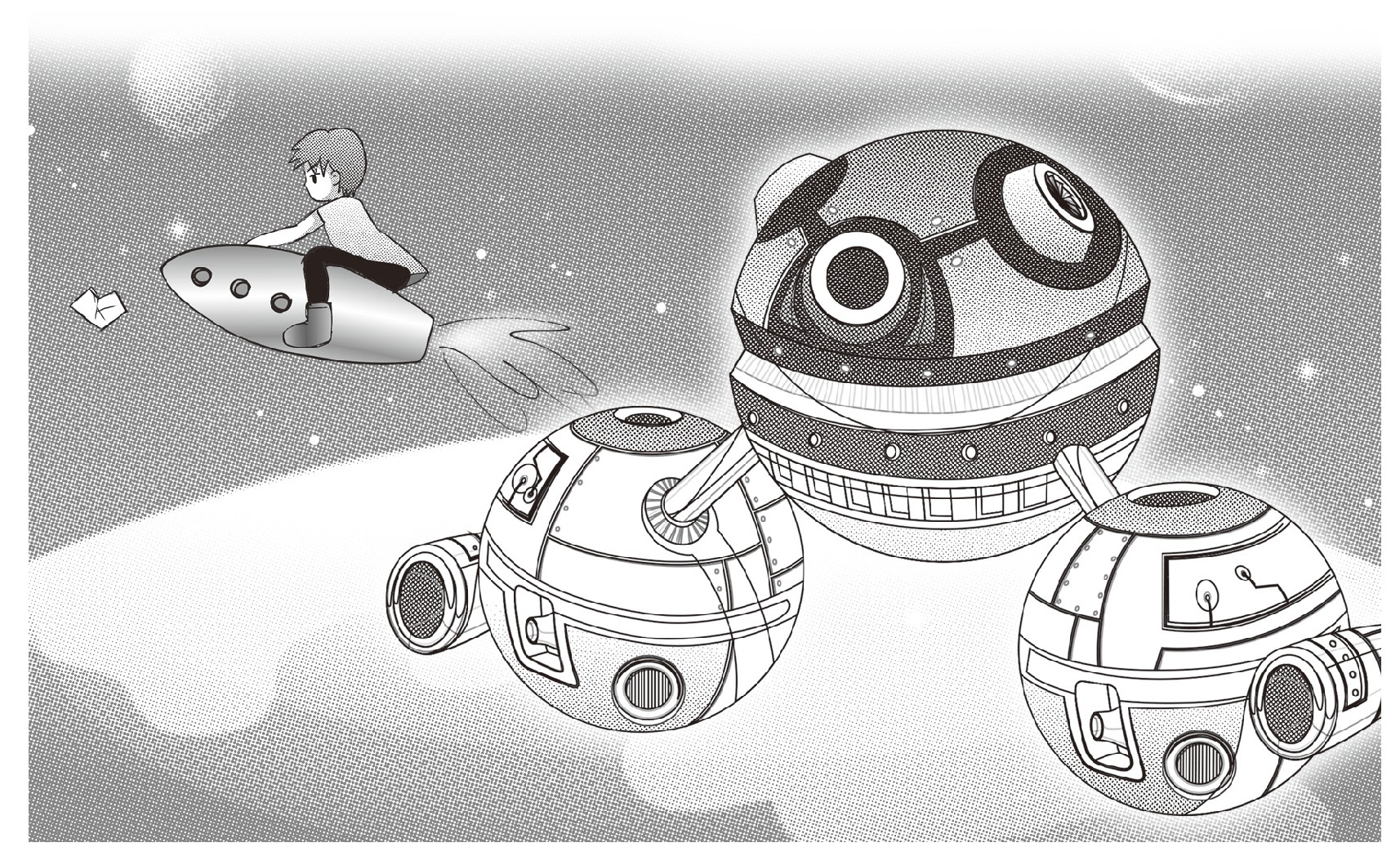 叔叔说完,就拿着一把造型奇特的枪,驾驶着太空飞行座(一种以灵活著称的小型太空飞行器,形似座椅)进入了太空。