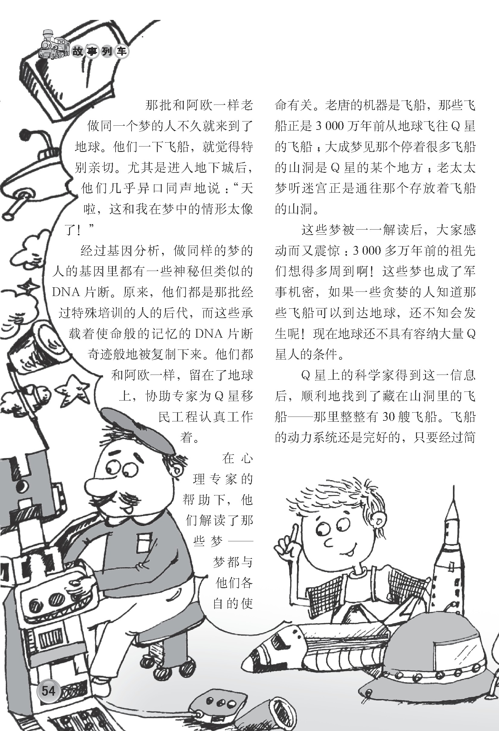 在心理专家的帮助下,他们解读了那些梦——梦都与他们各自的使命有关。老唐的机器是飞船,那些飞船正是3 000万年前从地球飞往Q星的飞船;大成梦见那个停着很多飞船的山洞是Q星的某个地方;老太太梦听迷宫正是通往那个存放着飞船的山洞。