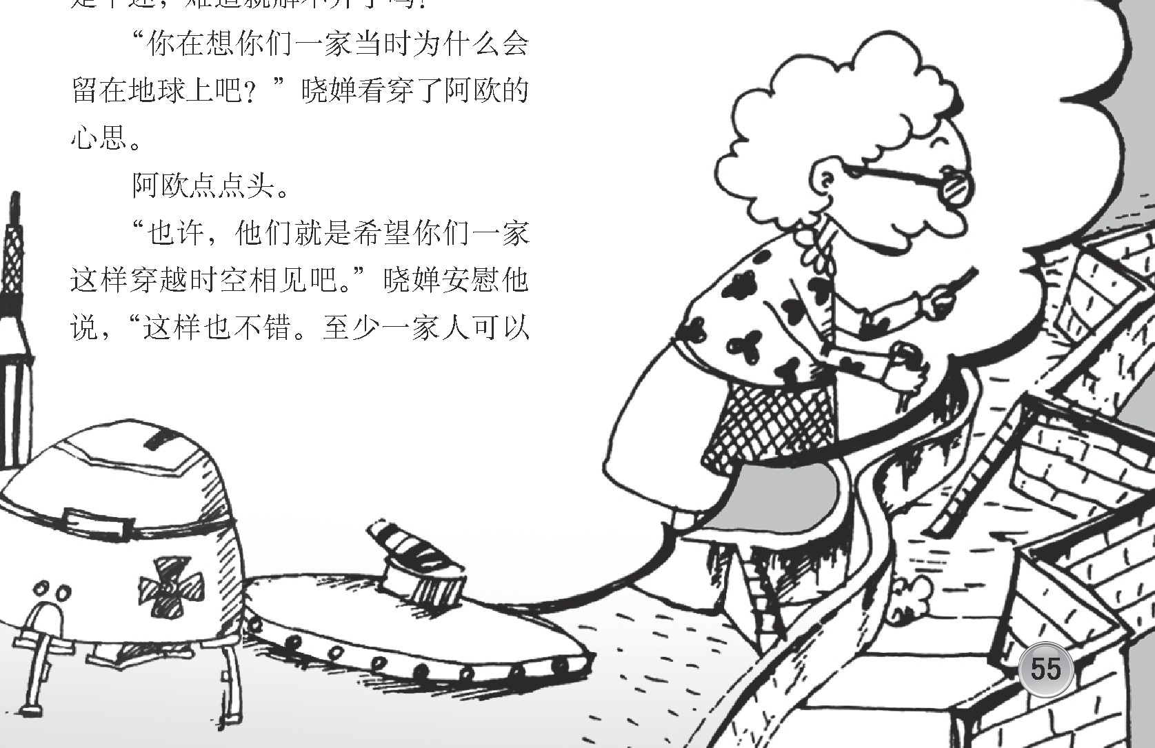 阿欧坐在两个婴儿的床前,看着他们开心地玩,心里安静极了。阿欧心想:“等你们长大了,我要怎么和你们相处?怎么称呼你们?我们一家为什么会留在地球上呢?这真是个迷,难道就解不开了吗?”