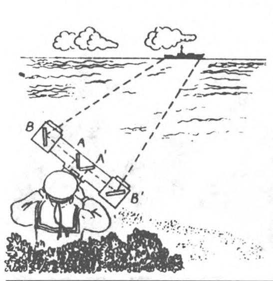 物体离我们越远,视差就越小。因此,在观测远处物体的时候,就应该尽量增大视差,以便准确判断物体的位置。在雷达发明以前,海军测距用的观察镜,就是一根扩大视差的长筒(见左下图)。它的两端各有一面反射镜B、B',外来光线通过B、B'反射后达到A、A',再经过A、A'反射进水兵的眼中(图中虚线所示)。这样一来,水兵双眼间距就从AA'扩大到了 BB',因此,水兵就能较准确地判断远处物体的位置了。