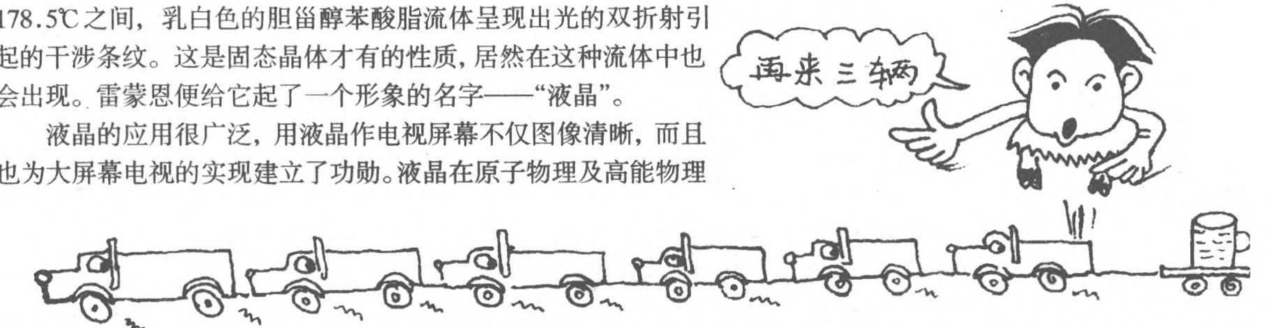 19世纪80年代的一天,奥地利植物学家莱尼茨尔正在一间简陋的实验室做实验。他把一种名叫胆留醇苯酸脂的晶体放在试管里加热。当温度升至145.5℃时,晶体开始熔融为乳白色的混浊流体。在整个熔融过程中,大家都知道由于晶体吸收熔解热,所以温度停止上升,直至所加的热量使晶体熔融后,温度才能继续上升。可是这个实验出现了奇怪的现象,当温度升至178.5℃时,再次出现了温度停止上升的现象,此时混浊的流体开始变成清亮的液体,待液体完全透明后温度又徐徐上升了,这是怎么回事呢?