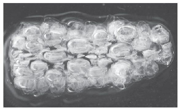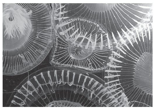 这种看起来像收集了好多泡泡的瓶子的生物,科学家称为“火体虫”,长约7厘米,是一种球形的聚合体生物,那些泡状物就是聚合体的“居民”。每一个微小的个体都像泵一样给有机体提供水分和养分,使得这个聚合体能够生存,同时还发出光芒。