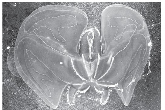 科学家发现这种长约15厘米的栉水母。它与海蜇的近亲,生活在情况多变的水面附近。与它的近亲不通的是它那黑色的外形,之前在该物种的研究中从未曾发现。