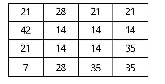 如图所示,欲使竖列和横列的数字总和等于70,只须删掉四个数字即可。试问,应删掉哪四个数字?