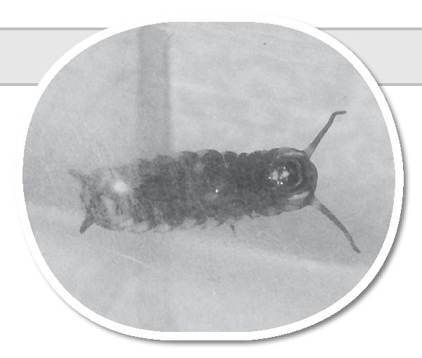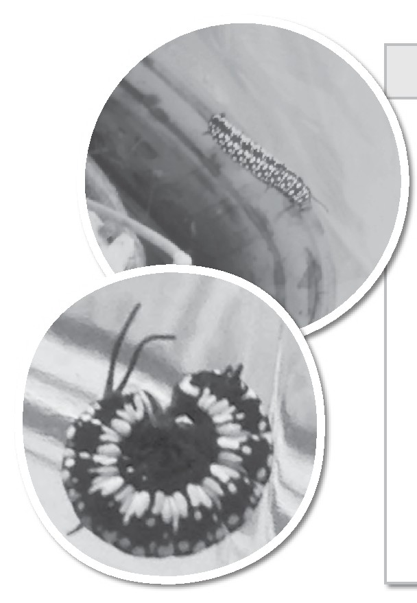 毛毛虫的头上有两根黑黑的触角,它穿着一件黑黄相间的“衣服”,上面有黄色、红色、白色的斑点,尾部不仅有两根又黑又尖的小刺,还有一圈白色螺旋形的花纹。这条毛毛虫并不大,身体大约只有三厘米长。它有八对脚,前三对是胸足,后五对是腹足和尾足。