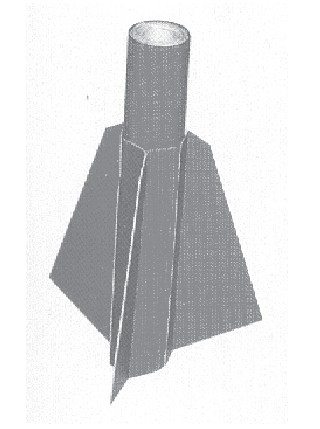 1.用彩纸卷一个圆筒形,然后从卡纸上剪三对如图所示的纸片,粘合在圆筒上做翼。