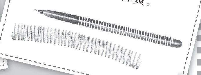 3.将旧台历上的铁线圈取下来,拉直后缠在圆柱体上自制一个弹簧。