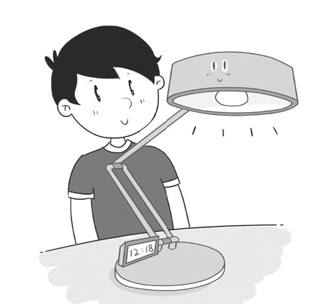 我发明的这款台灯十分新潮:它具有根据环境的明暗亮度来自动调光、调色的功能;为了方便携带,它还可以折叠,台灯高30厘米,宽15厘米;台灯外表为淡蓝色,造型独特;底座旁边还设计了一个在夜间发荧光的钟。