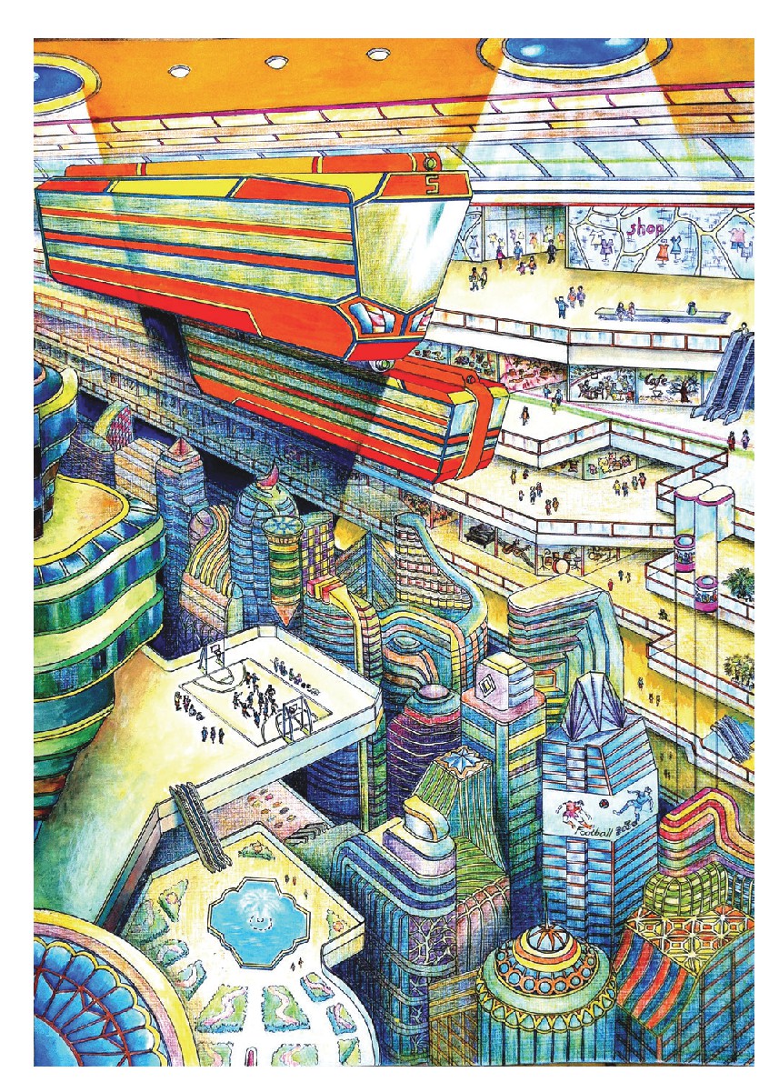 这张画描绘的人类在地下城活动的场面,交通工具是利用氢能推动的激光轨道,地下照明采用太阳能发电的形式,既环保又绿色无污染。地下城市的发展会给你带来便捷与奇妙的活动空间,也能体现人类用高科技建设未来地下城市的智慧。