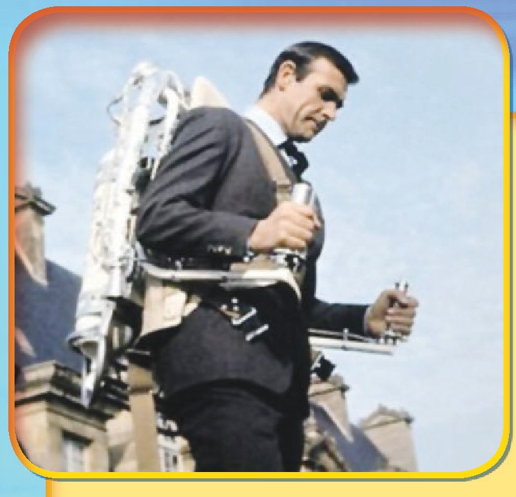 在1965年的邦德电影《雷霆万钧》中,肖恩·康纳利使用了贝尔飞行带。这种装置能让一个成年人飞起来,越过9米高的障碍物,飞行速度也达到了可观的每小时约16公里。但它最大的缺陷在于仅能持续飞行20~30秒,但燃料消耗却非常惊人。2011年世界上第一种商业单人喷气式飞行背包完成测试,这种背包的风扇每分钟旋转6 000转,它携带的燃料足以让它维持30分钟的飞行,在地面远程控制下,飞行背包将操作者上升到了30.5米的空中。这种名为“马丁飞行背包”的装置很有希望将单人飞行的梦想变为现实。