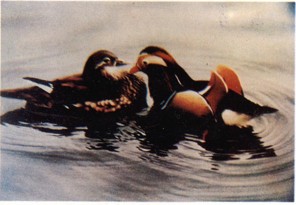 ▲鸳鸯:又称匹鸟,繁殖季节常成对活动。雌雄异色,雄鸟羽毛华丽,背面黑褐、腹面白色、翼上有一对栗黃色帆羽;雌鸟头部灰色、背褐腹纯白。栖息于湖泊、沼泽地带,杂食性。主要分布于东北、华北和长江中下游地区。