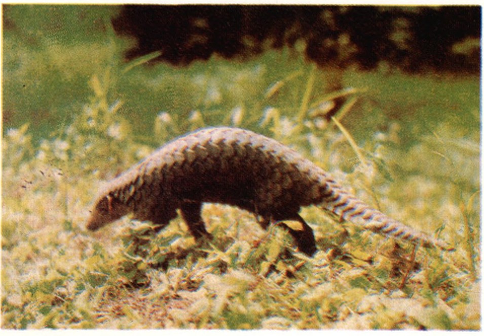 ▲穿山甲:又名鲮鲤,长约1m,除腹面及四肢内侧生毛外,其余部分被角质鳞甲,鳞片之间长有针毛。四肢短,具五趾,趾上有爪。白天多在洞内睡觉,晚上出来活动,食蚂蚁、白蚁。分布在我国南方各省,为著名药用动物。