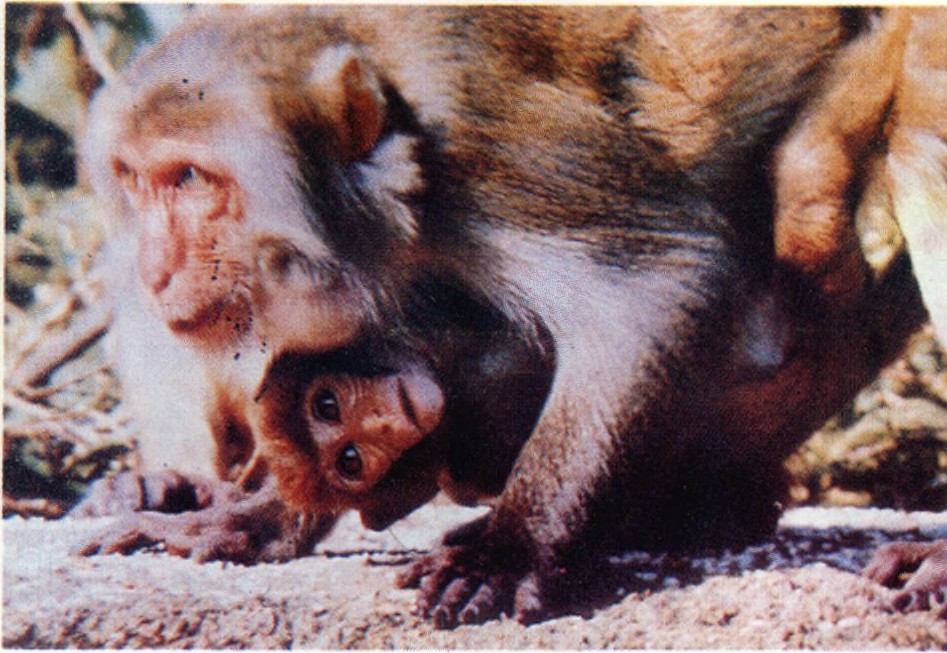▲猕猴:又名恒河猴、黄猴、广西猴。体长约50cm,尾长约20cm。体背上部棕灰色或棕黄色,下背部橙黄或橙红色。伴树栖性,多在陡峭山坡处活动,群体可达100只以上,杂食性。分布于除新疆、内蒙、青海、黑龙江、吉林、辽宁等省以外的广大地区。