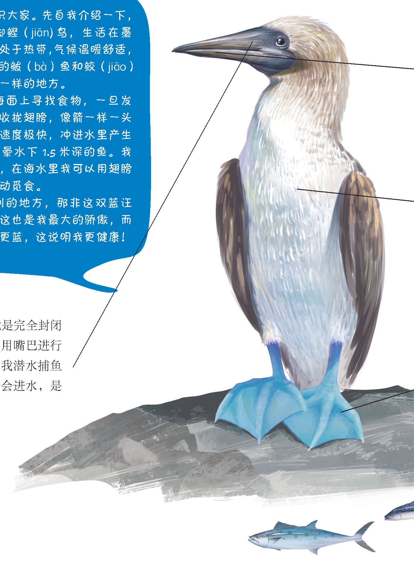 大家好,很高兴认识大家。先自我介绍一下,我叫蓝蓝,是一只蓝脚鲣(jiān)鸟,生活在墨西哥的太平洋边。这里处于热带,气候温暖舒适,景色宜人,我最喜欢吃的鲅(bà)鱼和鲛(jiāo)鱼也很多,真是像天堂一样的地方。