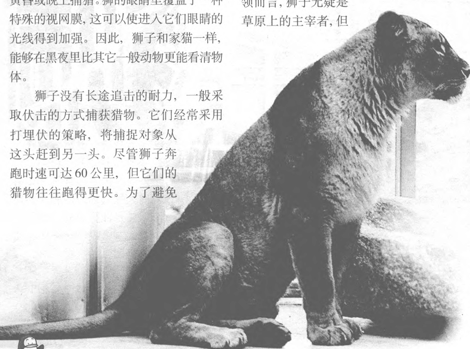 另外,狮子不是一个好的游泳者。它们需要水,而且偶尔还会袭击河马,但它们并不乐意到水里去。更为糟糕的是,有些雄狮在与河马较量时,会不小心陷身水中被淹死。因为它们身上浓密的鬃毛在吸水后,会无情地把它们拖向死亡。