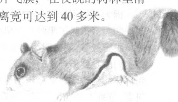 北美飞鼠就是有名的“空中飞翔机”,它的前后肢之间有覆盖软毛的皮褶,被人们称为飞膜。当它的四肢伸开时可以展开飞膜,在夜晚的树林里滑翔,飞行距离竟可达到40多米。