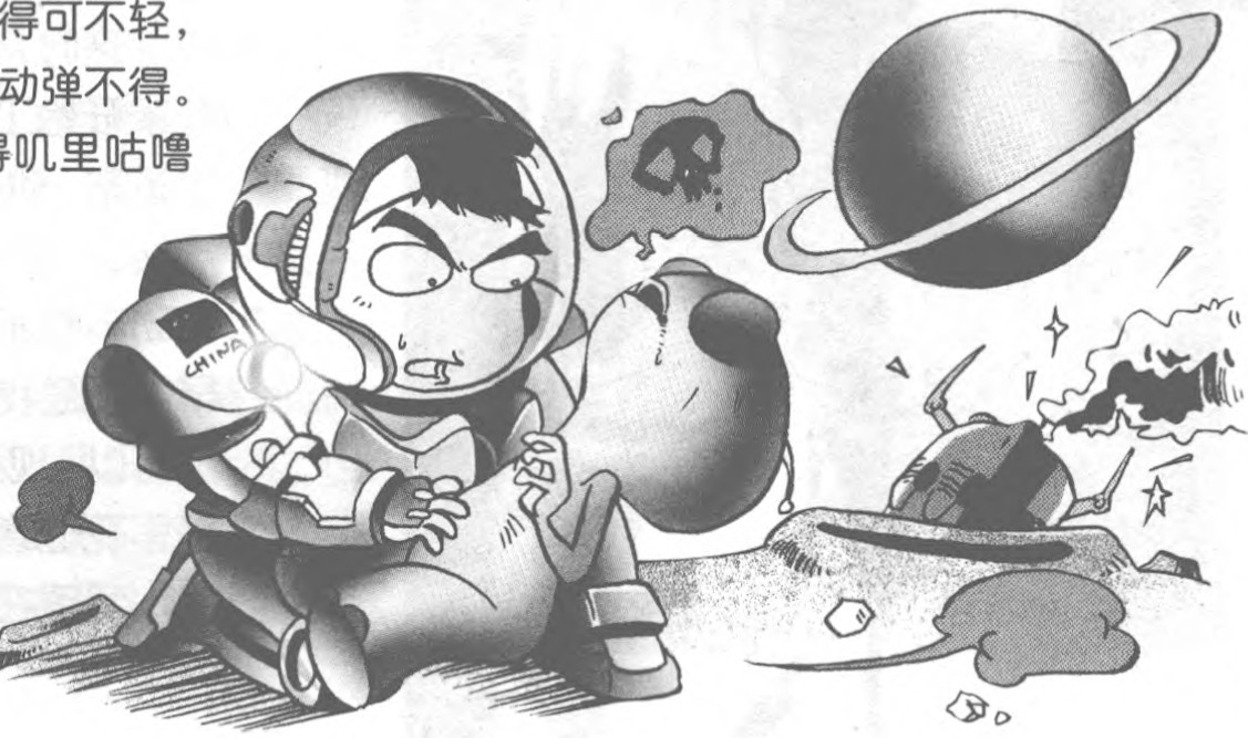 我们顾不上欣赏美景,端起星际信号搜索仪,开始寻找时强时弱的SOS急救信号来源。突然,我发现不远处散落着飞行器的残骸,心中猛然一惊。这时,星际信号搜索仪尖叫起来:“发现生命!发现生命!”我迅速飞奔而去,只见一个巨大的天坑旁躺着3个怪模怪样的外星人:头像蝗虫脑袋,青蛙似的身体,恐龙样的脚趾。看上去,外星人伤得可不轻,伤口汨汨地流出绿血,动弹不得。他们一见我们,高兴得叽里咕噜地吐出一大串外星语。我见状连忙打开星际语言交流机,才听懂他们的话:“我叫尤文思,来自火星。我们一家到太空旅游,不巧飞船发生了故障,又碰到百年不遇的陨石流,飞船迫降在月球上。尊敬的地球人,请救救我们吧! ”我连忙呼叫医疗急救船,迅速将他们送入空间站医院。我们的医生赶紧给外星人动手术,伽玛光刀轻轻划过,血马上止住了,很快就长出了肌肉。