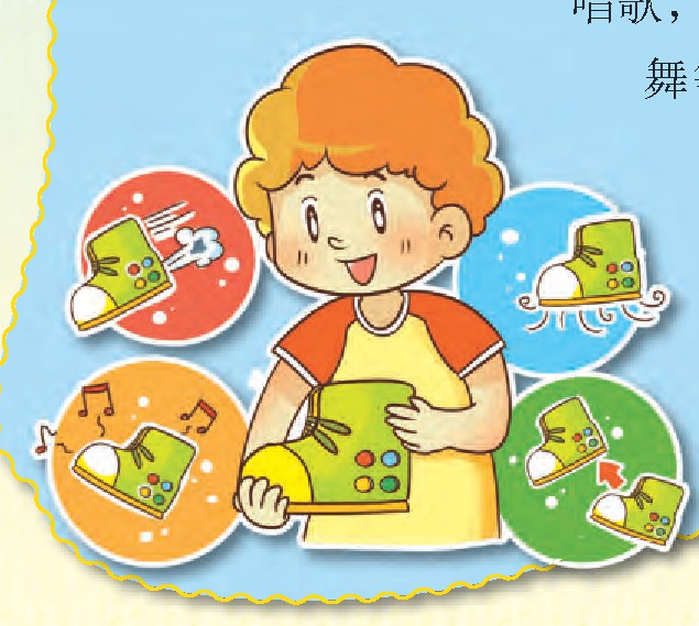 你上学要迟到了,就按红色按钮,助你加速跑到学校;夏天时,你的脚底又闷又臭,你只要按一下蓝色按钮,鞋子上的小孔就会自动打开,让你的鞋子通气通风;鞋底还有音响,因为鞋底装了微创芯片。无论你在哪里跳舞、唱歌,只要按黄色按钮,就会发出动听的声音来,有街舞等歌。我发明的鞋子还会随着季节的变化而变颜色。当你按绿色按钮时,春天变成浅绿,让你感受春天的清新;夏天就变成深绿,让你感受夏天的热烈;秋天变成黄色,让你感受收获的快乐;冬天变成红色,让鞋子像阳光一般火热,使你有温暖的感觉。