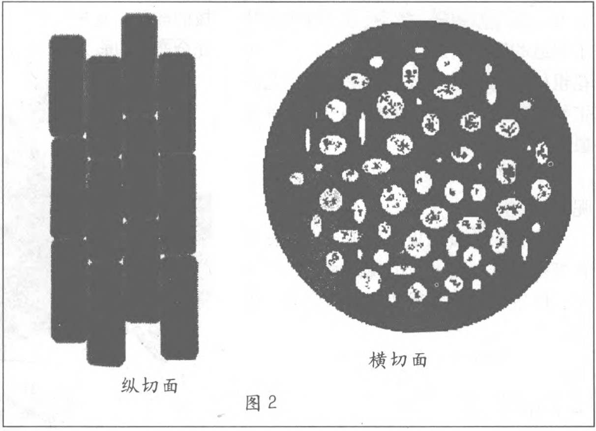 我们把这些主干枝条进行横切和纵切。把横切面放在显微镜下观察,发现了一粒粒有些透明的细胞,它们的排列比较松散,这些是运输水分的导管。通过纵切,可以清楚地看到里面一条条的木质纤维,再把靠近树皮的部分放在显微镜下观察,可以看到运输营养的筛管。我们把叶子花的枝条插在红墨水里观察,并与其它植物的枝条进行比较。结果发现叶子花的枝条吸收红墨水的速度比较快,证明这种植物的茎里的确有发达的运输水分和营养的系统。(见图2)