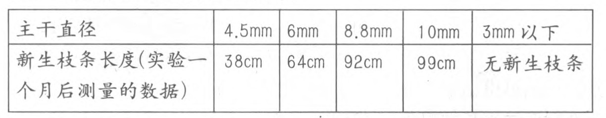 那么,这些生长快的枝条是它的主干给它提供了营养吗?我们拨开浓密的小枝,对每一枝生长快的枝条的主干进行了检查,发现生长快的枝条全部都是从很粗的主干上长出来的,主干越粗新生的枝条越长。观测的数据如右表: