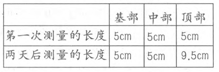 我们把一株枝条按长度平均分成三等份,并做好记号。两天以后观察,结果是中部和基部的长度没有变化,只有顶端长长了。记录表格如下: