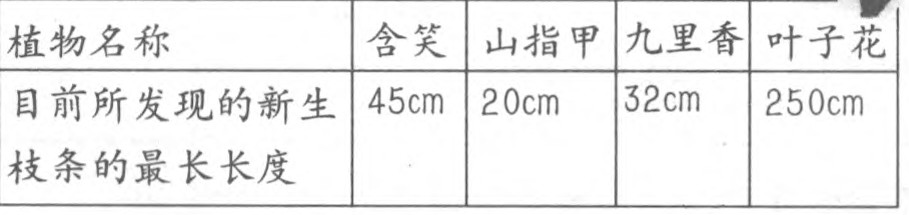 在我们的校园里还发现含笑、九里香等植物也有被剪后出现快速生长的现象,但生长速度不是那么快。调查数据如下表: