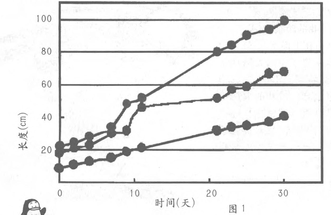 我们选了8支快速生长的枝条,贴上标签,每隔两天测量一次。结果是快的一天长5 ~ 6厘米,慢的一天长1 ~ 2厘米,其中的3枝生长曲线图如图1。