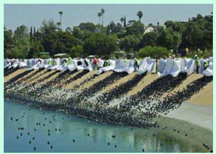 现在的水质污染是越来越严重了,而用来储水的水库也变得不是那么安全,研究证实,经过太阳长时间的照射,水库里的水容易产生一种含有溴化物和氯的潜在有害混合物,这种混合物可能会诱使人体细胞产生癌变。为了防止这种致癌物的生成,美国把4 0万个黑色塑料球倒进了伊凡霍伊水库,避免太阳直接照射到水上面,从而抑制这种混合物的生成。