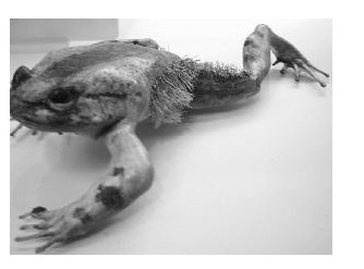 多毛蛙在遇到敌人时不惜折断自己的骨头,以伸出像猫爪一样的锋利骨刺与敌人作战。这种蛙类的骨骼分离和刺穿皮肤的结构特征非常特殊,与其他脊椎动物有明显区别。