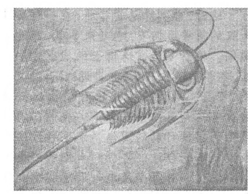 生活在距今6亿年至3亿年前的三叶虫,是原始海洋中最早出现的节肢动物。属底栖动物。它们的身体分为头、胸、尾三部分,头部有马蹄形的甲状盖片和一对触须,胸部中间为有节的中轴体,两侧是肋叶,又属附肢,在游动中能起桨的作用。尾部呈分叉状。