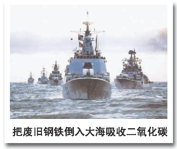 科学家最近提出:把废旧钢铁倒入大海,可以刺激海洋中的浮游生物快速生长,这些海洋中的浮游生物也能吸收二氧化碳。如今,地球上的大量废旧钢铁无处安放,如果将这些废旧钢铁倒入海洋,不但能吸收一部分二氧化碳,还清洁了环境,可谓一举两得。